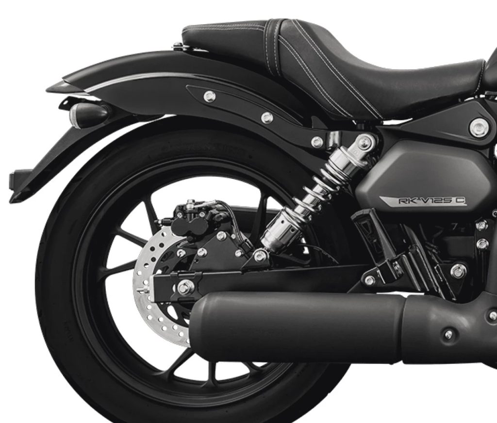 Zadní část modelu RK V125C se vyznačuje perfektním pohodlným sedlem, širokou zadní pneumatikou a masivním výfukem, charakteristickými znaky pro motocykl stylu cruiser.