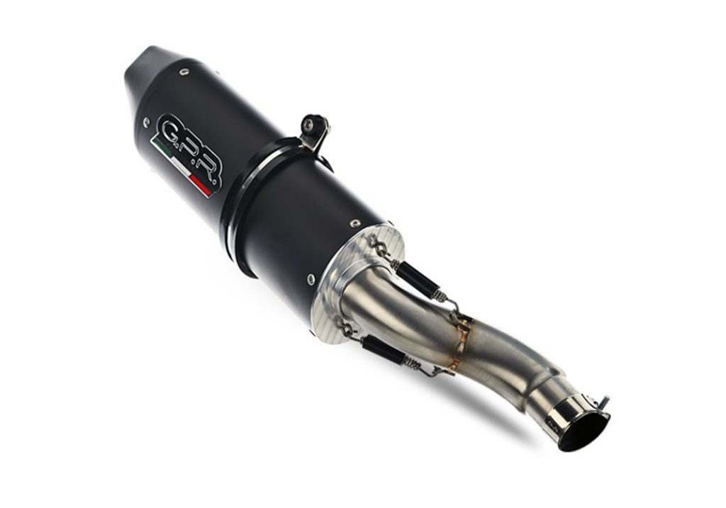 Dvojitá koncovka výfuku Slip-on GPR FURORE NERO K.148.CAT.FUNE Matná černá zahrnuje odnímatelné db killery, spojovací svody a katalyzátory