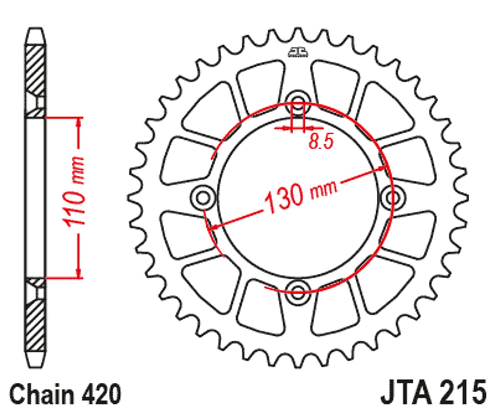 Hliníková řetězová rozeta JT JTA 215-55RED 55 zubů, 420 červená
