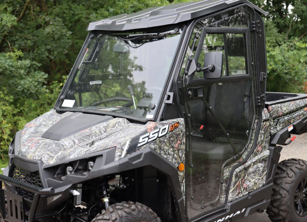 Vyhřívaná kabina pro UTV Linhai 550 T-BOSS, bez střechy (lze použít originální dodávanou střechu), čiré polykarbonátové dveře, uzamykatelné, o 180° otevíratelné, s posuvnými okny, přední okno z bezpečnostního skla se stěračem a ostřikovačem, zadní čelo z čirého tvrzeného UV-odolného polykarbonátu, teplovodní topení.