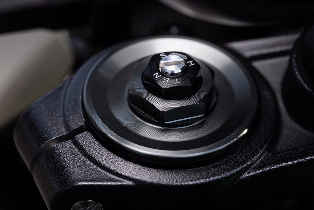 Obrácená přední vidlice o průměru 41 mm nabízí jisté a klidné ovládání ve všech jízdních situacích od města až po horské silnice. Velmi kvalitní vidlice nabízí kromě plynule nastavitelného předpětí možnost nastavení komprese a tlumení odskoku, což umožňuje přesné nastavení podle preferencí každého jezdce a stylu jízdy a nabízí lepší schopnost absorbovat nerovnosti. Vnější trubky vidlice ve zlaté barvě ladí se zadním centrální tlumičem Öhlins S46.