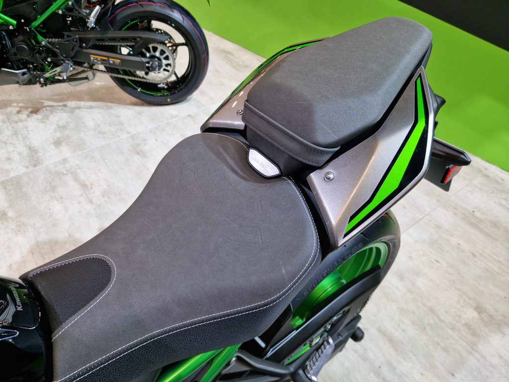 Velmi kvalitní, hodnotně vypadající dvoubarevné sedadlo se vzhledem připomínajícím pravou kůži má v oblasti stehen (boční a spodní část sedáku) parádní ručně prošitou dělící linii ve stylu dalších prémiových strojů Kawasaki.