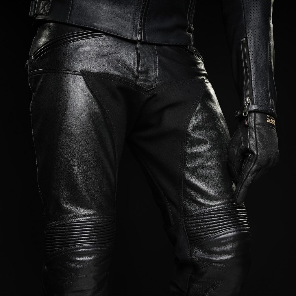 Patentované uchycení chráničů v kožených kalhotách.