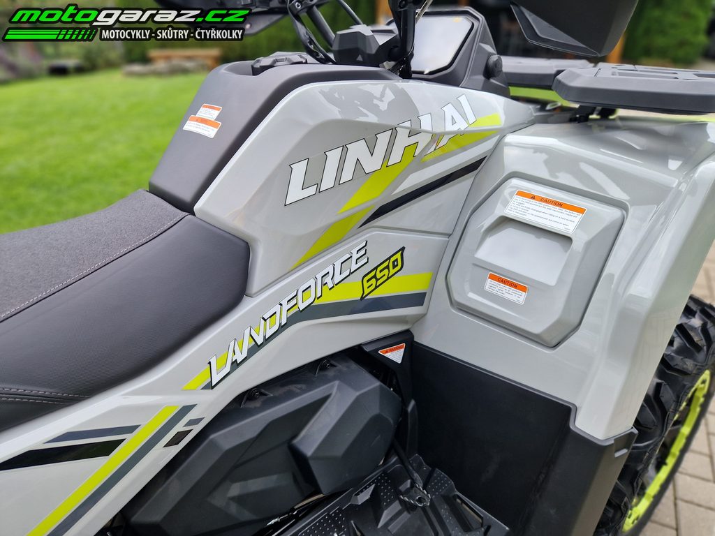 Linhai Landforce 650L Pro přináší mimořádně bohatou výbavu, která zahrnuje plně nastavitelné tlumiče s oddělenou nádobkou piggyback, masivní přední a zadní ocelový nárazník, atraktivní 14" osmipaprsková litá kola se systémem Beadlock a značkovými 26" pneumatikami Bulldog, hliníkové protiskluzové stupačky řidiče a spolujezdce, dvoubarevně prošívanou sedačku a opěrku zad spolujezdce, nebo barevně lakovaná A-ramena. Ve výbavě samozřejmě nechybí elektrický posilovač řízení, homologované tažné zařízení, 3000 lbs naviják, velký 7“ TFT displej, kompozitní nosiče vpředu i vzadu ani velkoplošné kryty rukou.