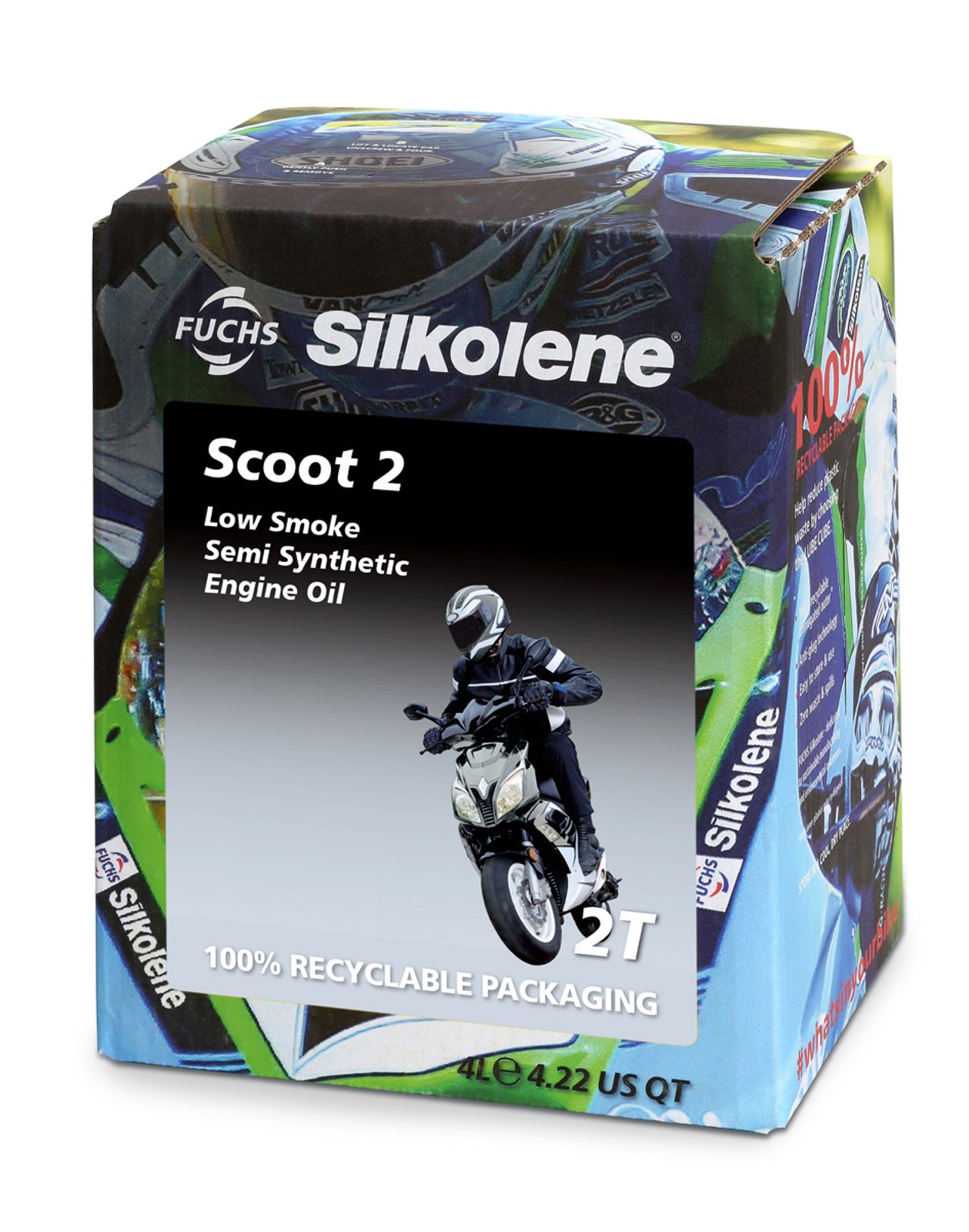 FUCHS SILKOLENE SCOOT 2 poskytuje vynikající vlastnosti proti opotřebení a je speciálně navržen pro skútry, mopedy a minibiky. Má složení pro čisté spalování, snižuje riziko předčasného zapálení směsi, zalepení pístních kroužků a znečištění zapalovací svíčky. SILKOLENE SCOOT 2 obsahuje přísady s nízkým obsahem popela a exkluzivní syntetickou chemii proti opotřebení, která zajišťuje dlouhou životnost motoru bez tvorby usazenin ve spalovací komoře.