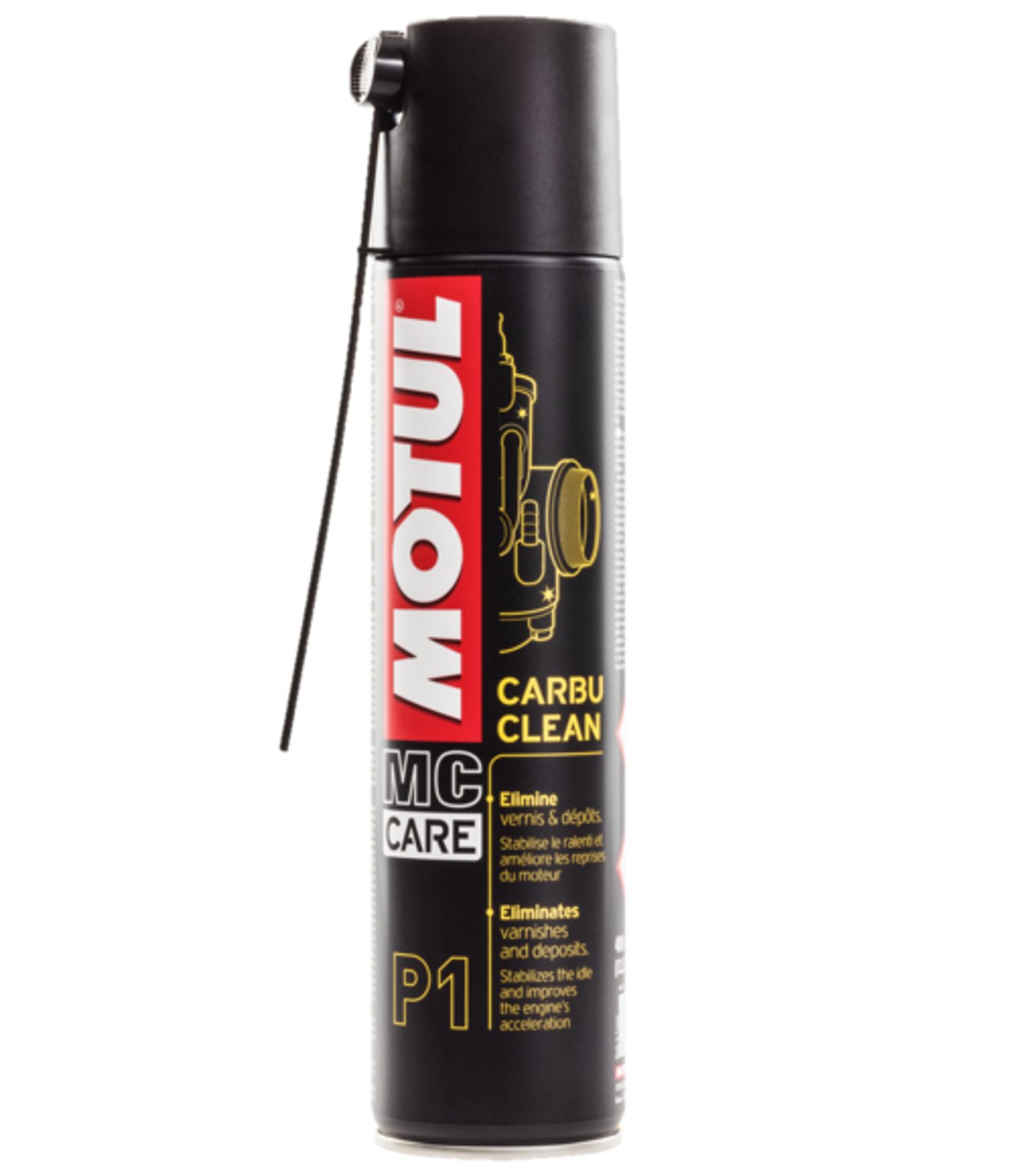 Motul® MC CARE™ P1 Carbu Cleaner je prostředek pro čištění a údržbu mechanických částí, který odstraňuje usazeniny a povlaky na škrticích ventilech, koši spojky, tryskách, nádržích, plovácích a Venturiho trubici. Stabilizuje volnoběh a zlepšuje akceleraci motoru.