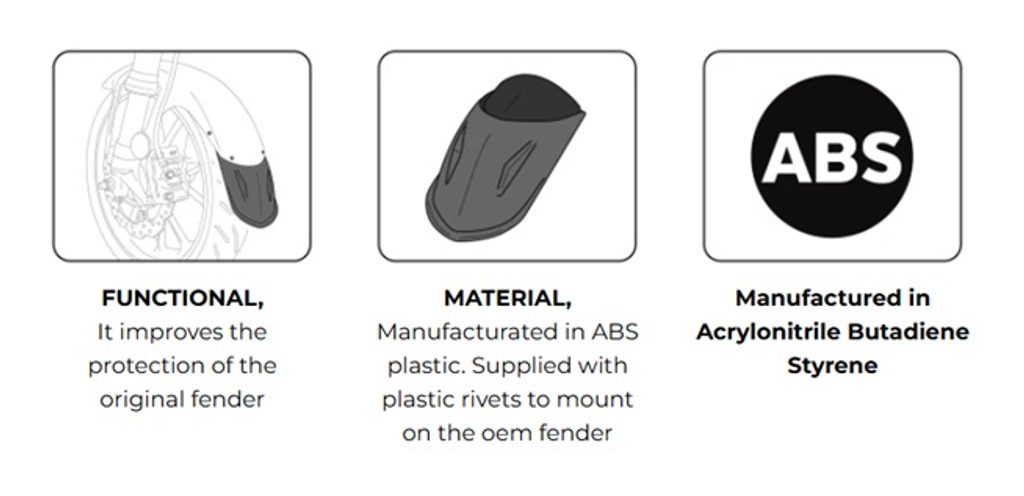 Zvyšte ochranu svého motocyklu pomocí prodloužení předního blatníku od značky PUIG. Prodloužení je vyrobeno z ABS materiálu, který je vysoce odolný proti nárazům, a představuje ideální ochranu proti nečistotám odlétajícím od předního kola, které by mohly zasáhnout kapotáž motocyklu nebo přímo vás. Prodloužení je dodáváno v černém provedení, aby ladilo s designem vašeho stroje.