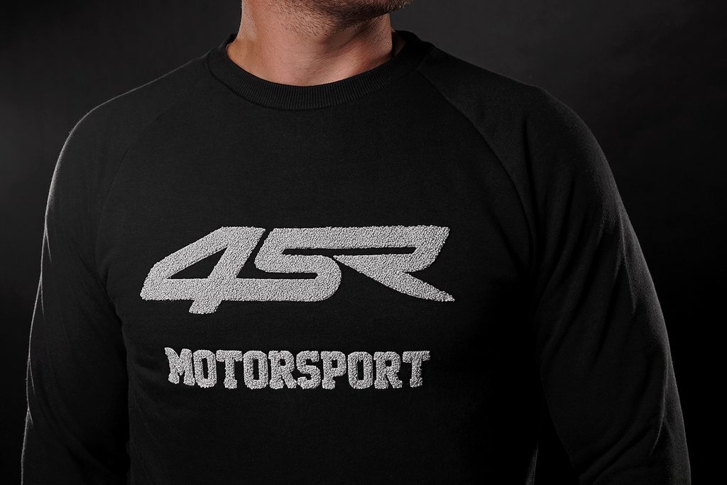 Černá mikina bez kapuce Motorsport Black s froté šedou výšivkou 4SR je vyrobena z příjemného materiálu French Terry.