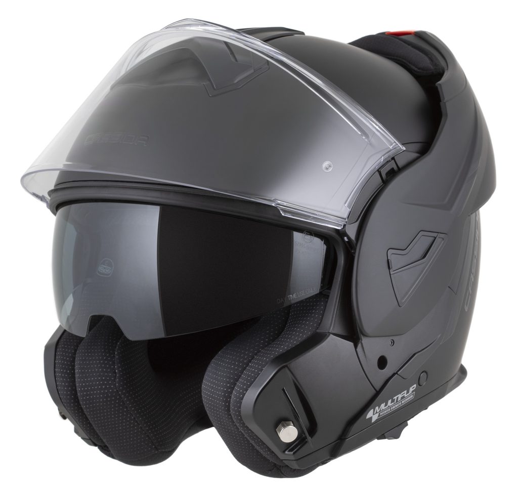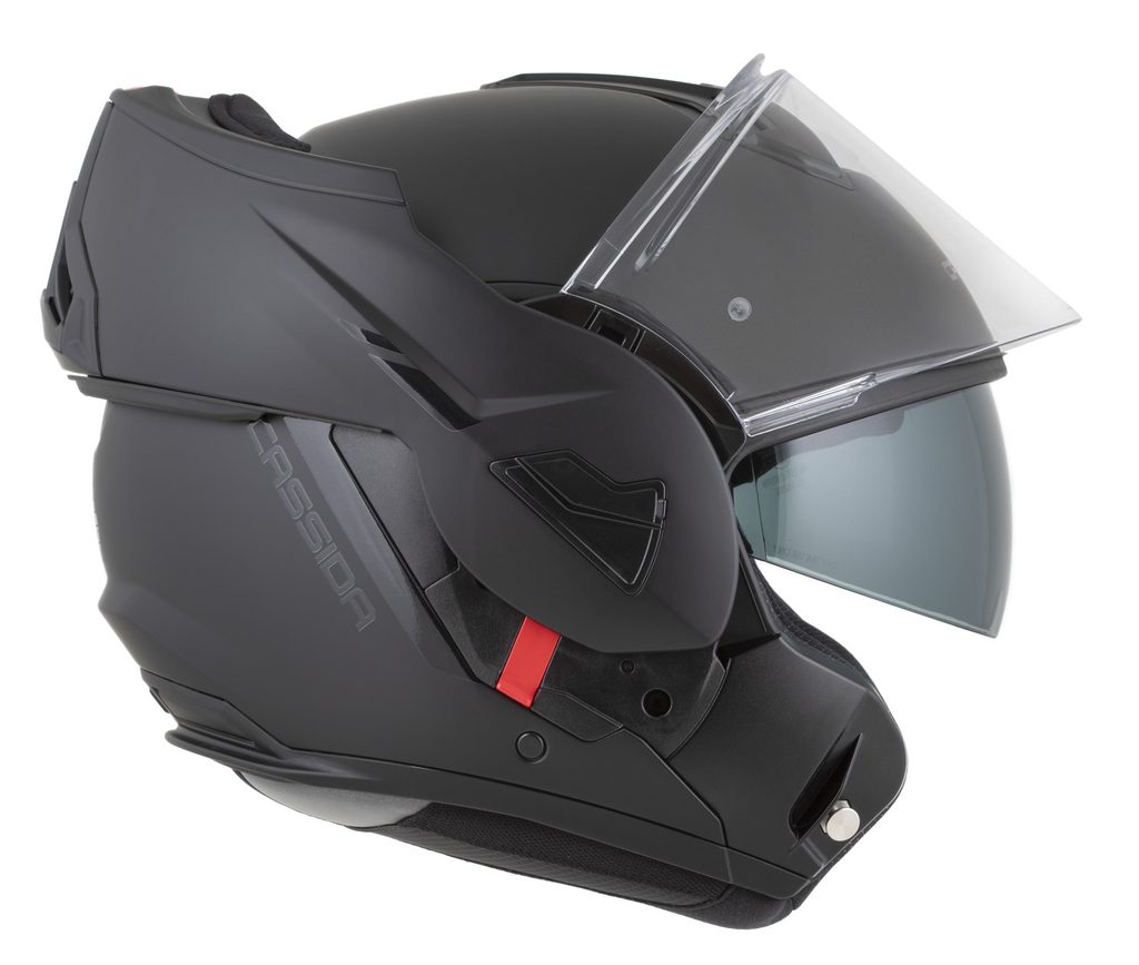 • Dvojí homologace ECE 22.06.P/J pro otevřenou a integrální přilbu s možností fixace výklopné části ve vyklopené poloze pomocí pojistky.