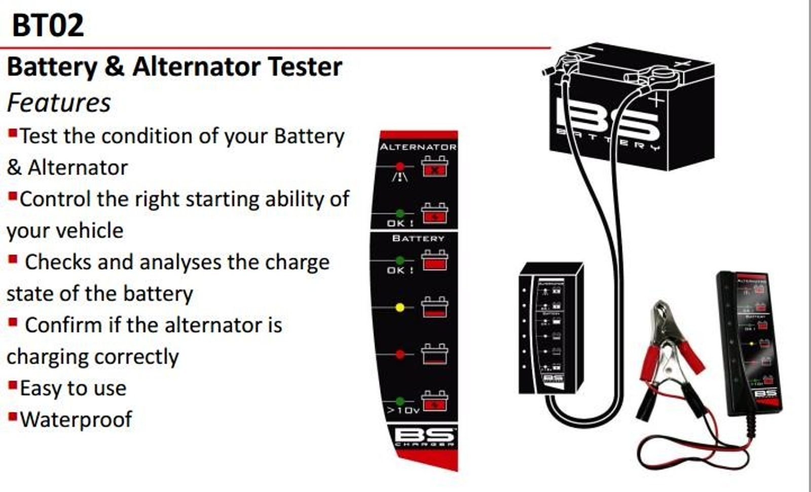 BT 02 je tester baterií a alternátorů navržený pro rychlou diagnostiku elektrických problémů. Poskytuje okamžitý výsledek a díky plně automatickému provedení jej nelze používat nesprávně.