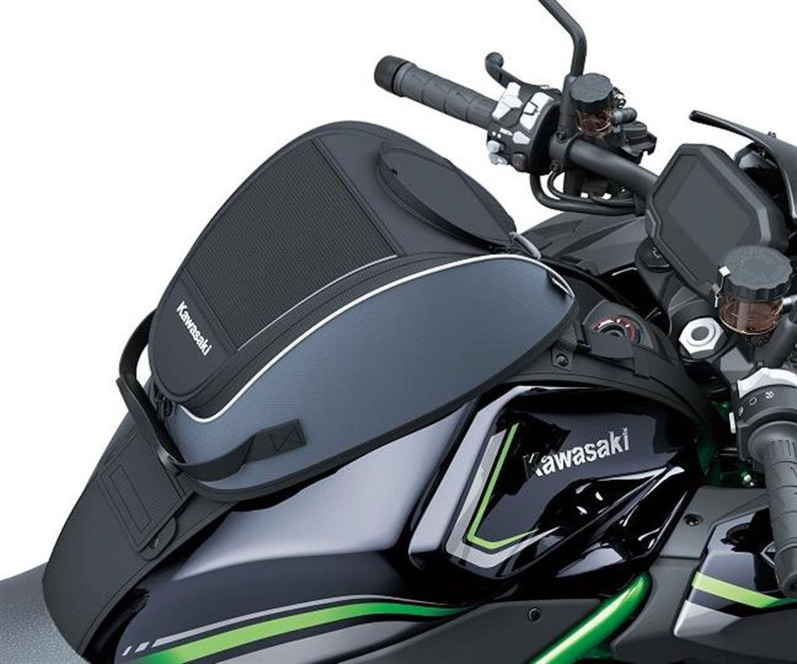 Robustní černošedý vak na nádrž s reflexními prvky a logem Kawasaki.