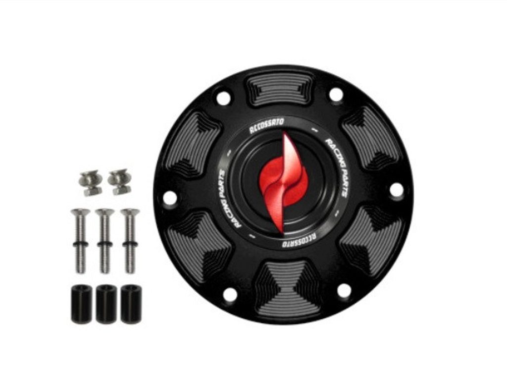 The new Accossato petrol tank cap for Triumph motorbikes has a new , eye-catching design. The quick-release pawl can be in various colours. The Accossato cap is made entirely of cnc-cut aluminium.