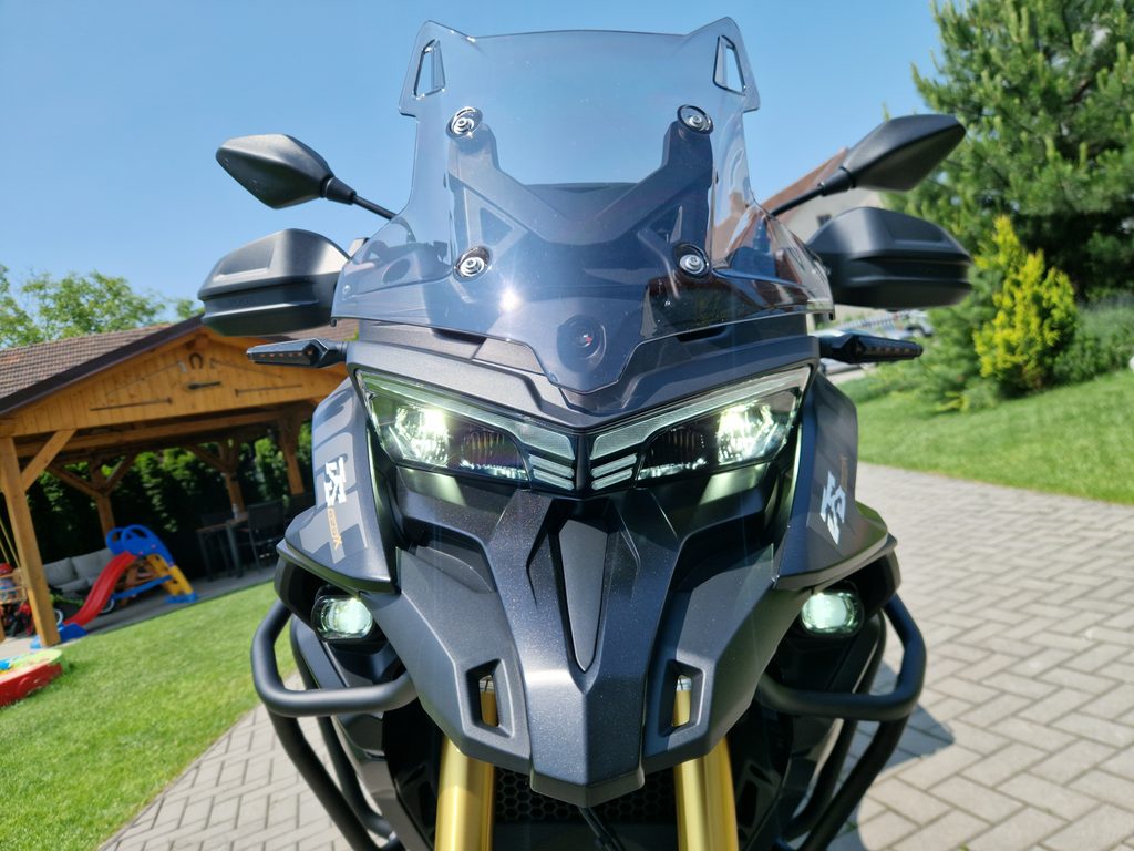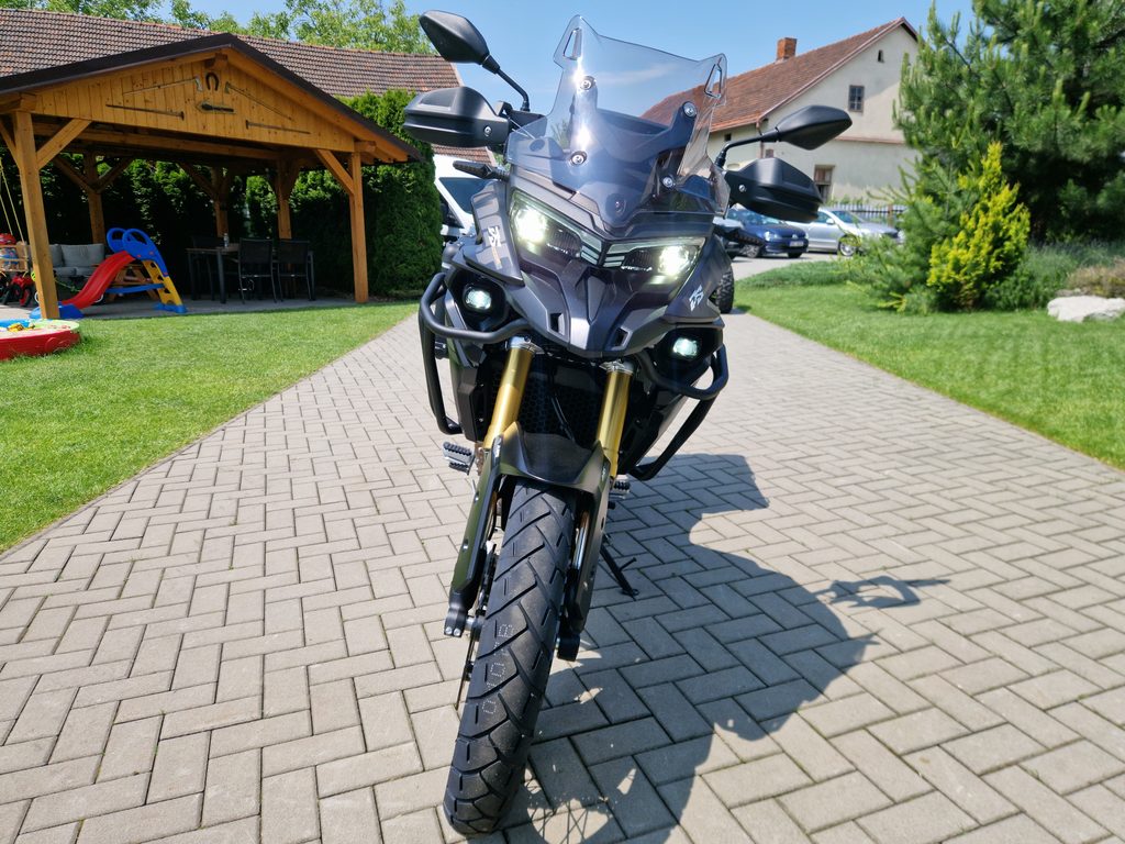 Těšit se můžeš taky na plexi, který si z místa řidiče bez nářadí nastavíš do dvou poloh. Oceníš i hliníkovej kryt motoru, LED světla včetně přídavnejch bodovek, boční i středovej stojan a hafo další výbavičky. Jo, a nově mám taky podsvícený ovladače na řídítkách, takže už žádný tápání ve tmě.