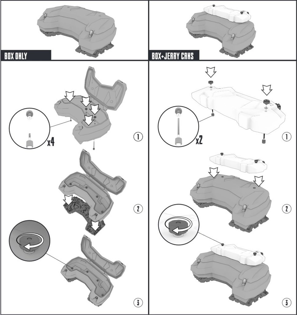 Tento box byl vyroben na míru pro čtyřkolky Polaris Sportsman XP 1000. Designem kopíruje tvary celého stroje a přesně zapadne do zadního nosiče. Nemusíš tak nic vyměřovat. Instalace je také velmi jednoduchá a nevyžaduje žádné vrtání nebo speciální vybavení. Stačí použít rychloupínáky, které jsou součástí boxu a připevnit je do zadního nosiče čtyřkolky. Poté box připevníš k nosiči skrze již předvrtané otvory a zajistíš.